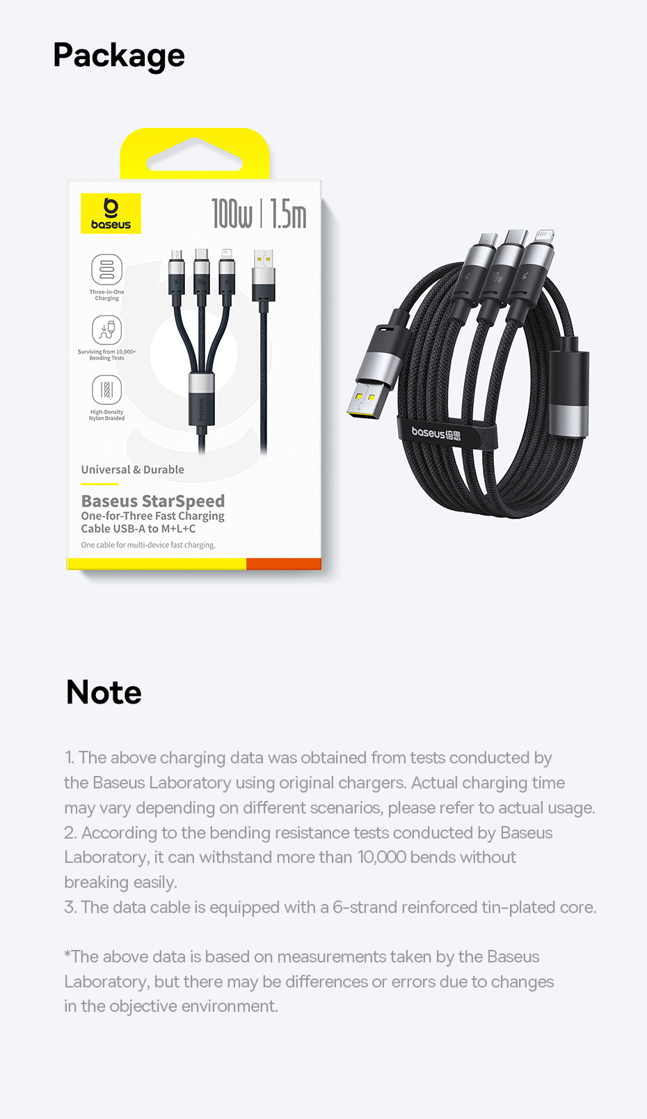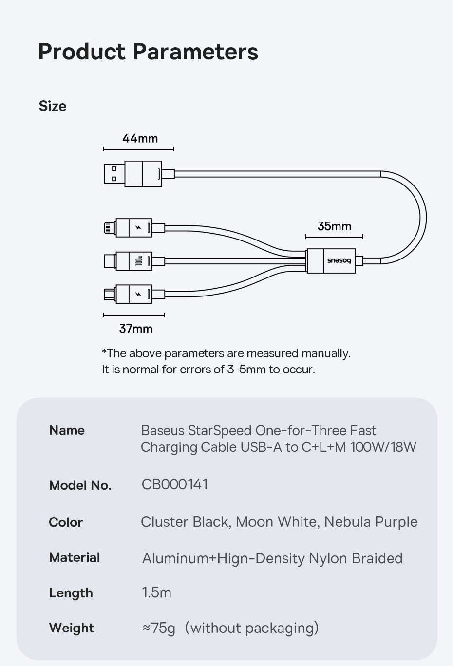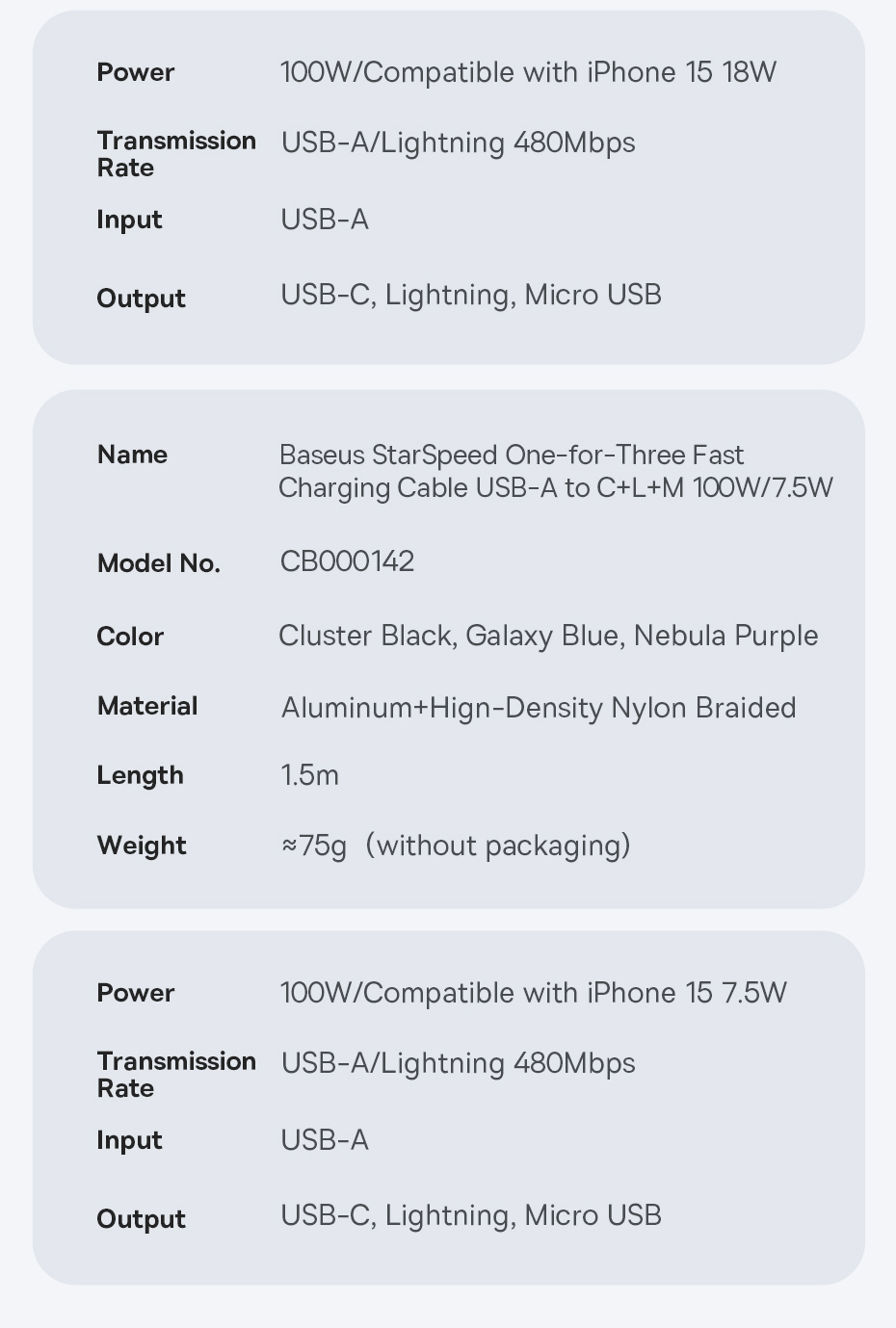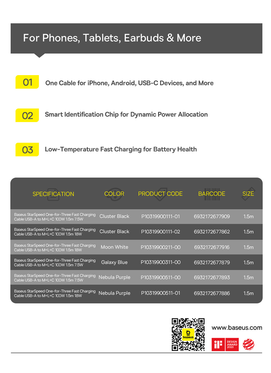 Cáp Sạc Đa Năng Baseus StarSpeed 1-for-3 USB-A to Type-C/Lightning/Micro là giải pháp lý tưởng cho những người dùng cần sạc đồng thời nhiều thiết bị với chỉ một cáp. Với công suất mạnh mẽ lên đến 100W cho Type-C, 2.4A cho Lightning và 18W cho Micro, sản phẩm này phù hợp với hầu hết các thiết bị như smartphone, tablet, laptop, đem lại sự tiện lợi và hiệu quả trong việc sạc.