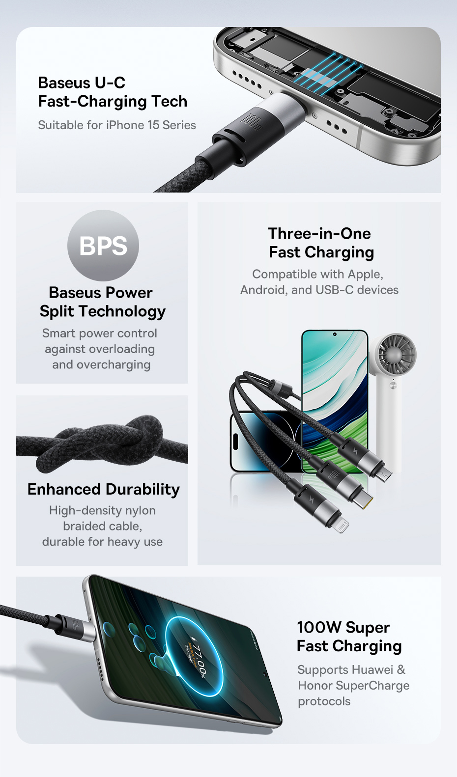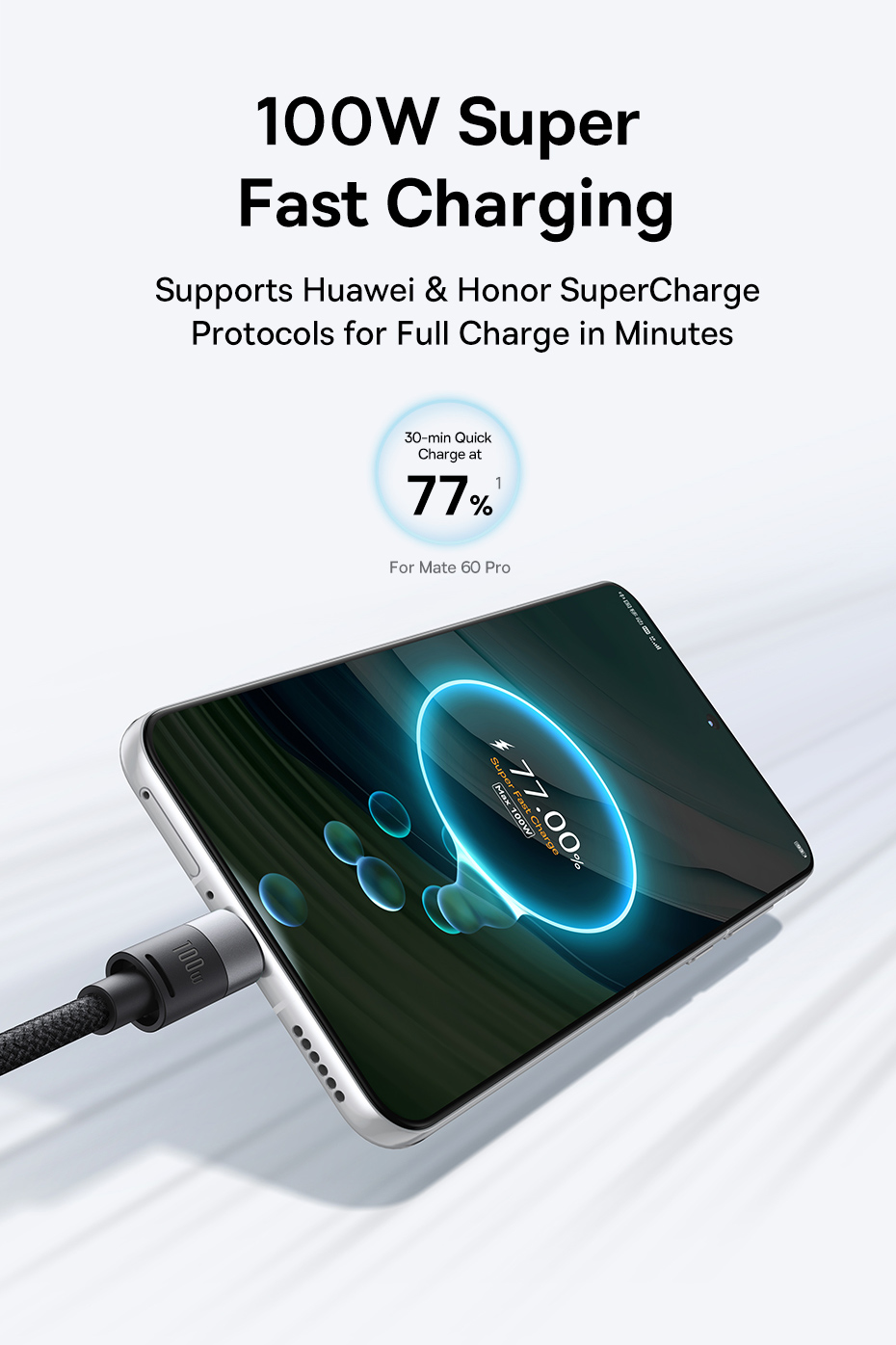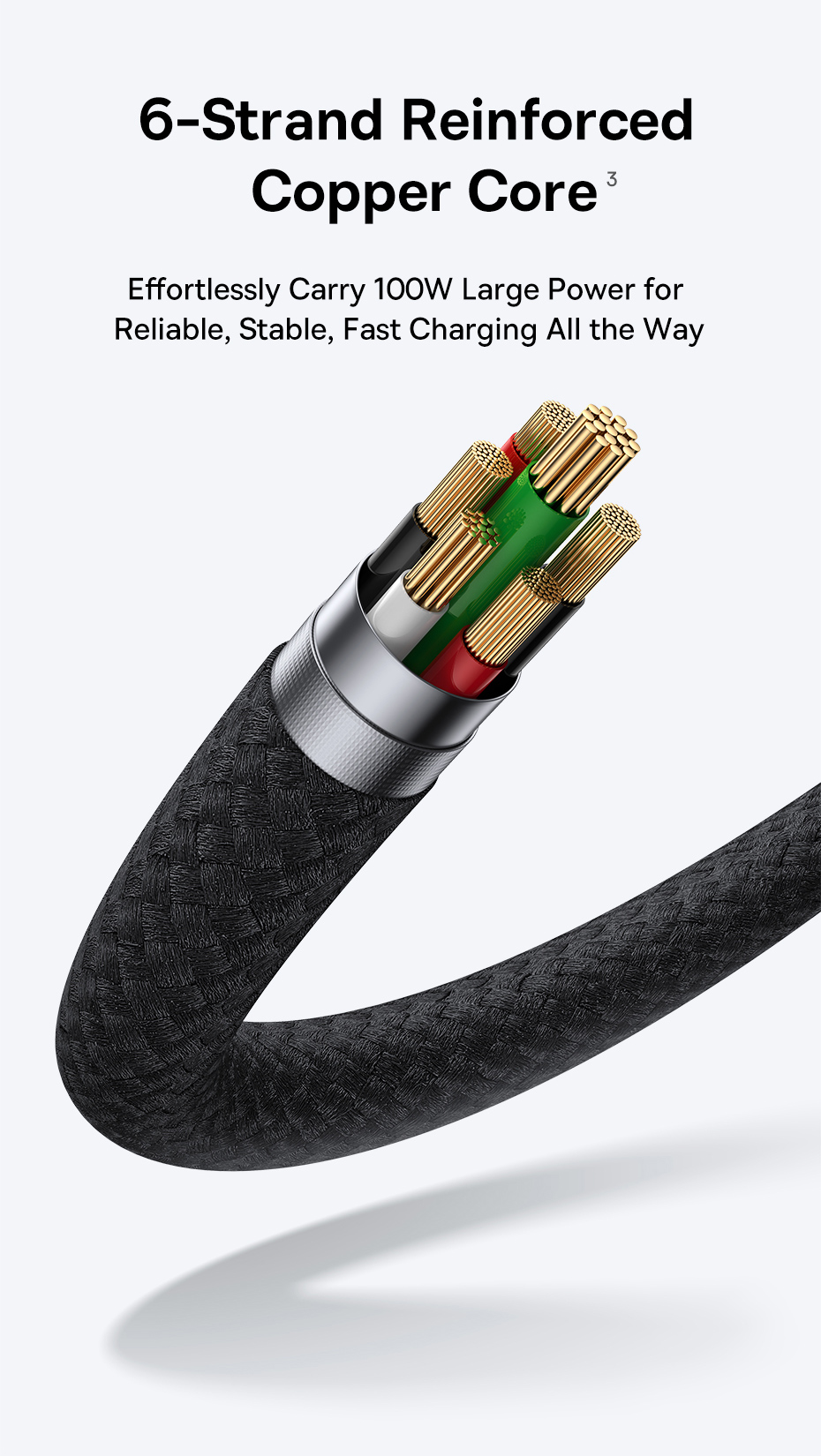 Cáp được làm từ chất liệu nylon bện cao cấp, giúp sản phẩm trở nên chắc chắn và bền bỉ, đồng thời chống đứt gãy và hạn chế tình trạng xoắn dây. Cáp đã vượt qua hơn 10,000 bài kiểm tra uốn cong, chứng minh độ bền và khả năng chịu lực vượt trội.