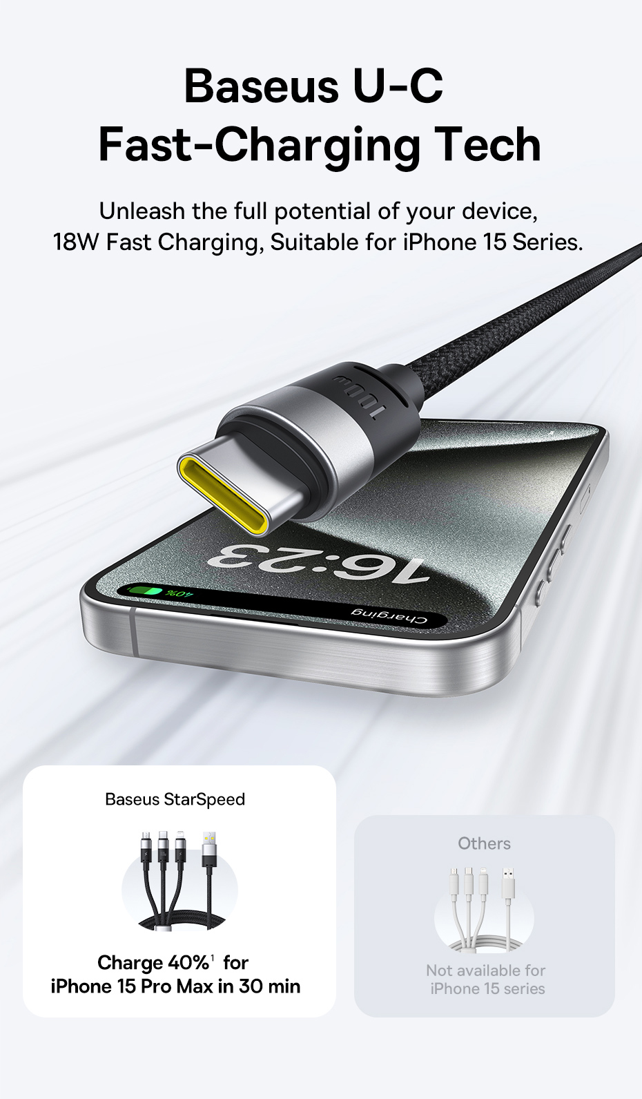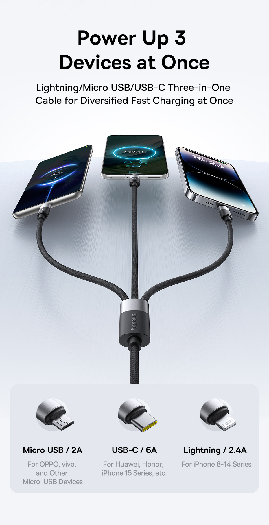 Cáp Baseus StarSpeed 1-for-3 cho phép bạn sạc cùng lúc ba thiết bị khác nhau thông qua các đầu kết nối Micro USB, Lightning và Type-C. Đây là lựa chọn hoàn hảo cho người dùng sở hữu nhiều loại thiết bị với các chuẩn kết nối khác nhau, giúp giảm thiểu việc phải mang theo nhiều dây cáp.