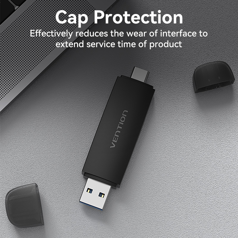 Hình ảnh sản phẩm: Đầu đọc thẻ nhớ VENTION CLK màu xám, có logo VENTION. Thiết kế nhỏ gọn với hai khe cắm thẻ (SD và TF) và hai đầu nối (USB-A và USB-C).