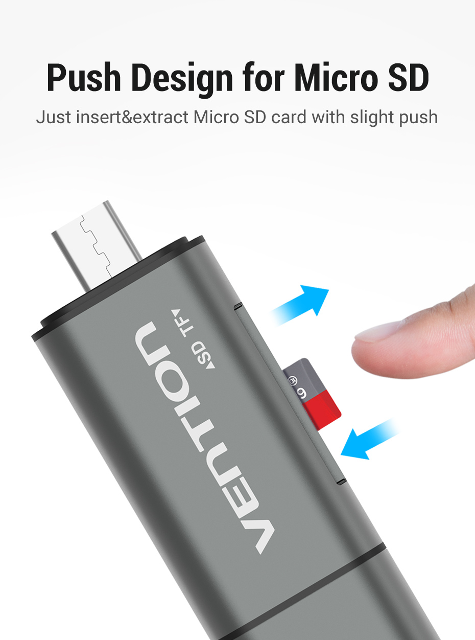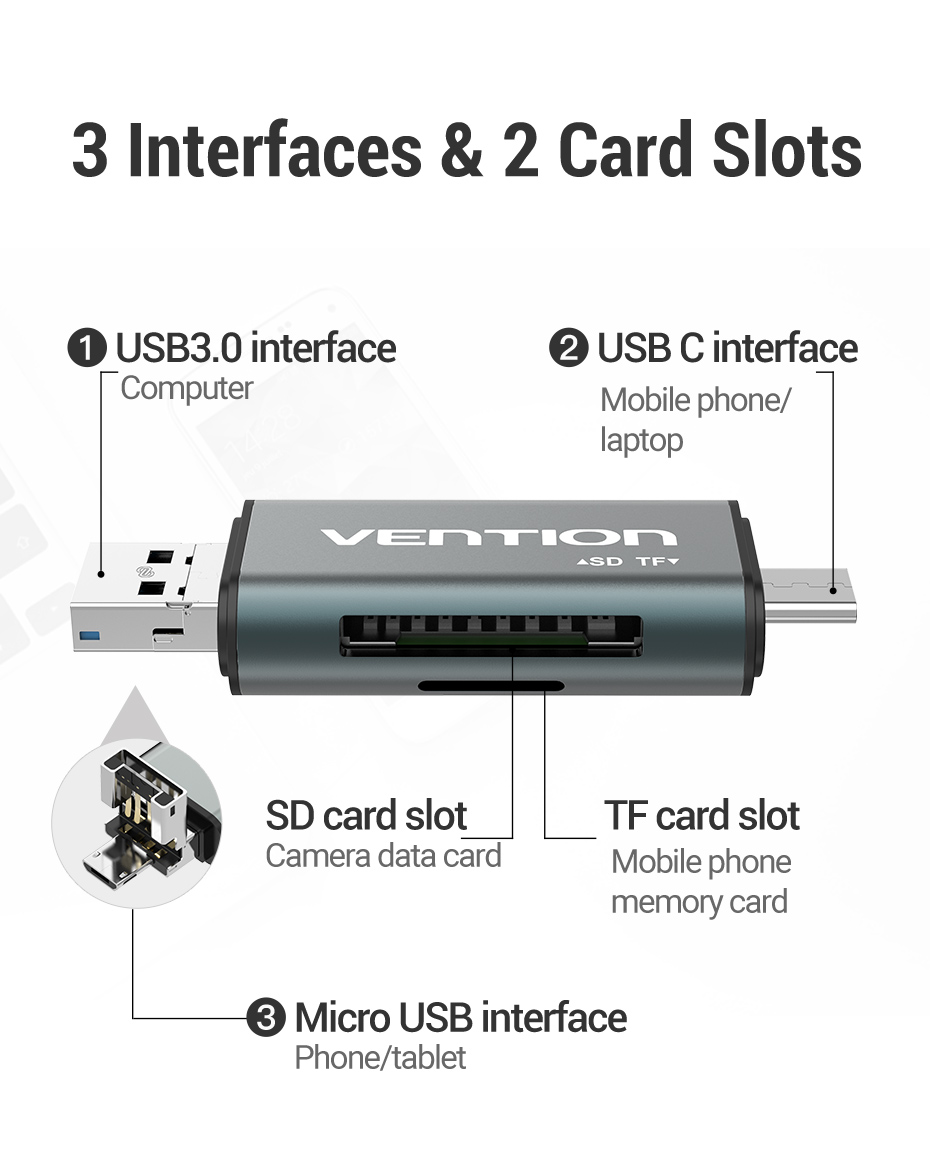 Đầu đọc thẻ nhớ OTG 2 in 1 VENTION CCH là giải pháp hoàn hảo cho việc truyền tải dữ liệu giữa các thiết bị di động, máy tính và thẻ nhớ. Với thiết kế đa năng 3 trong 1, hỗ trợ cả USB-C, Micro USB và USB-A, cùng khả năng đọc thẻ SD và TF (MicroSD), VENTION CCH mang đến sự tiện lợi và linh hoạt tối đa, cho phép bạn truy cập và quản lý dữ liệu mọi lúc, mọi nơi.
