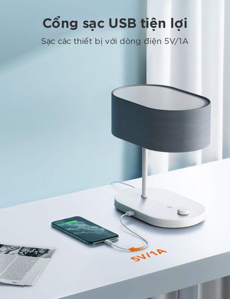 - Cổng sạc USB tiện lợi: Sạc các thiết bị di động ngay trên đế đèn, rất tiện lợi khi sử dụng.
