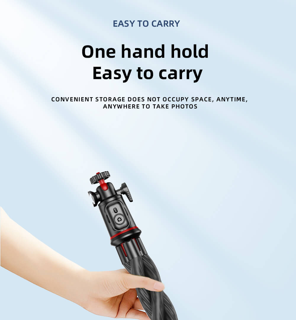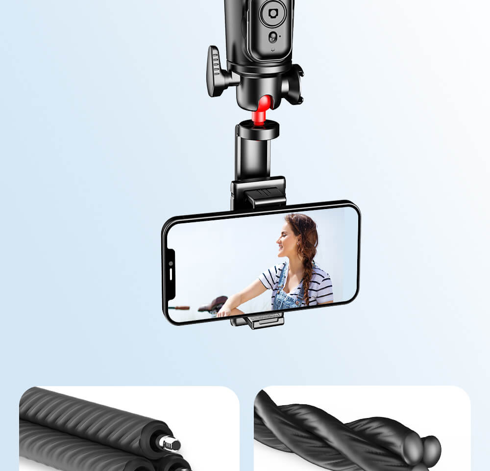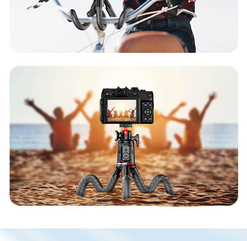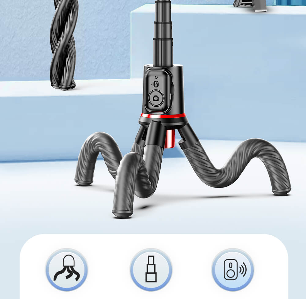 Gậy chụp ảnh Rtako C03 sở hữu các chân tripod dạng bạch tuộc có thể uốn cong, bám chắc trên nhiều loại bề mặt khác nhau như bàn, cây, cột hoặc những địa hình không bằng phẳng. Thiết kế này mang đến sự linh hoạt tuyệt đối, cho phép bạn chụp ảnh hoặc quay video ở mọi nơi, mọi hoàn cảnh.