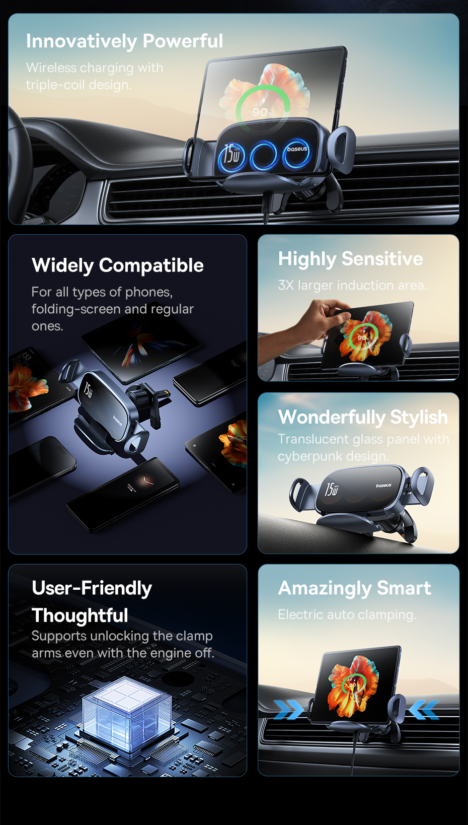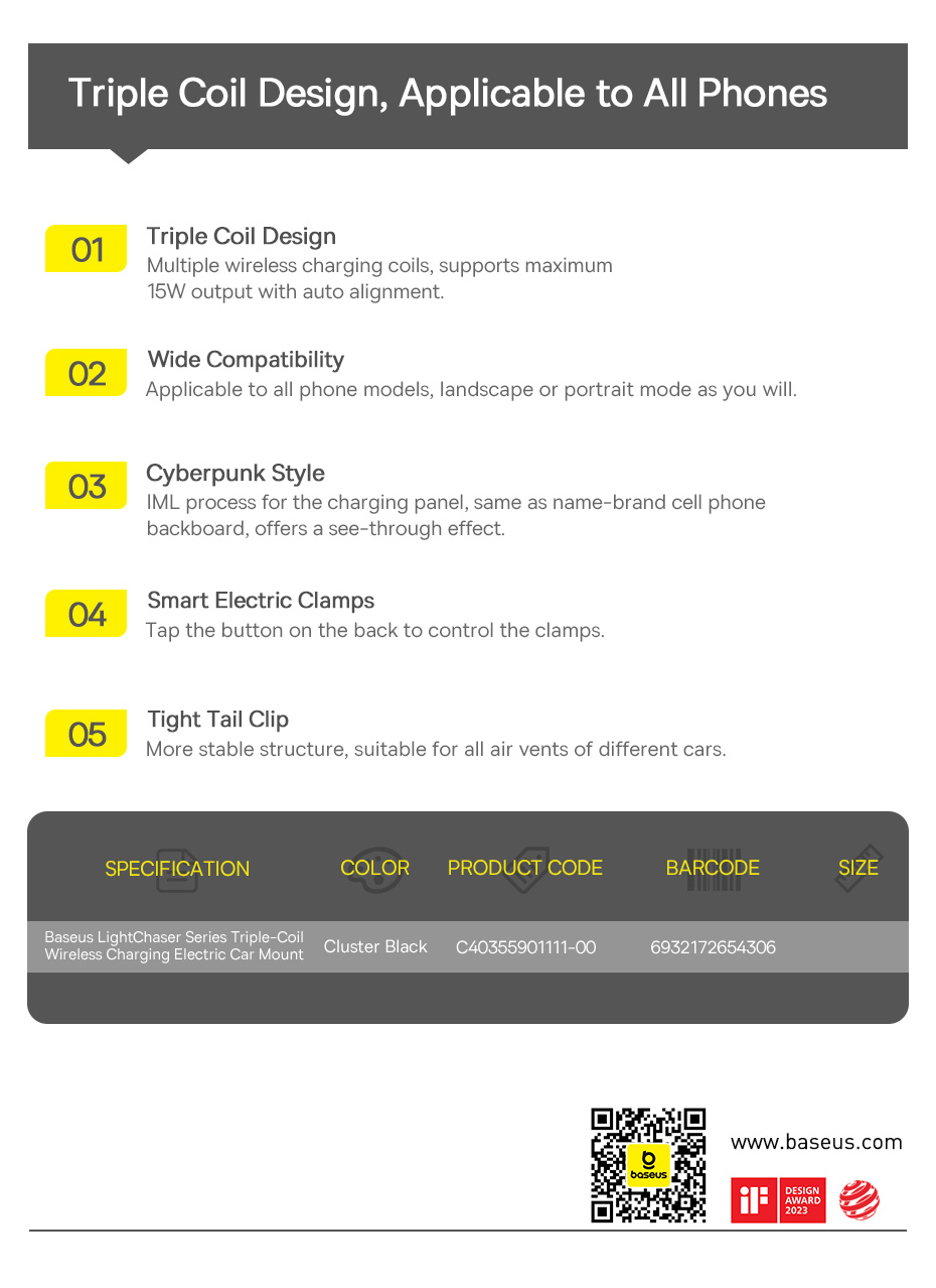 Giá Đỡ Điện Thoại Ô Tô Baseus Lightchaser Series Triple-Coil Wireless Charging Electric Car Mount là một giải pháp hoàn hảo cho việc sạc và giữ điện thoại của bạn một cách an toàn và tiện lợi khi lái xe. Với công nghệ sạc không dây 15W, thiết kế hiện đại và tính tương thích rộng, sản phẩm mang đến trải nghiệm người dùng tuyệt vời.