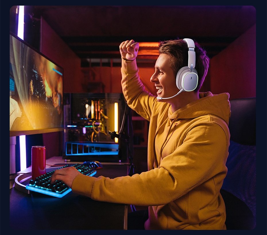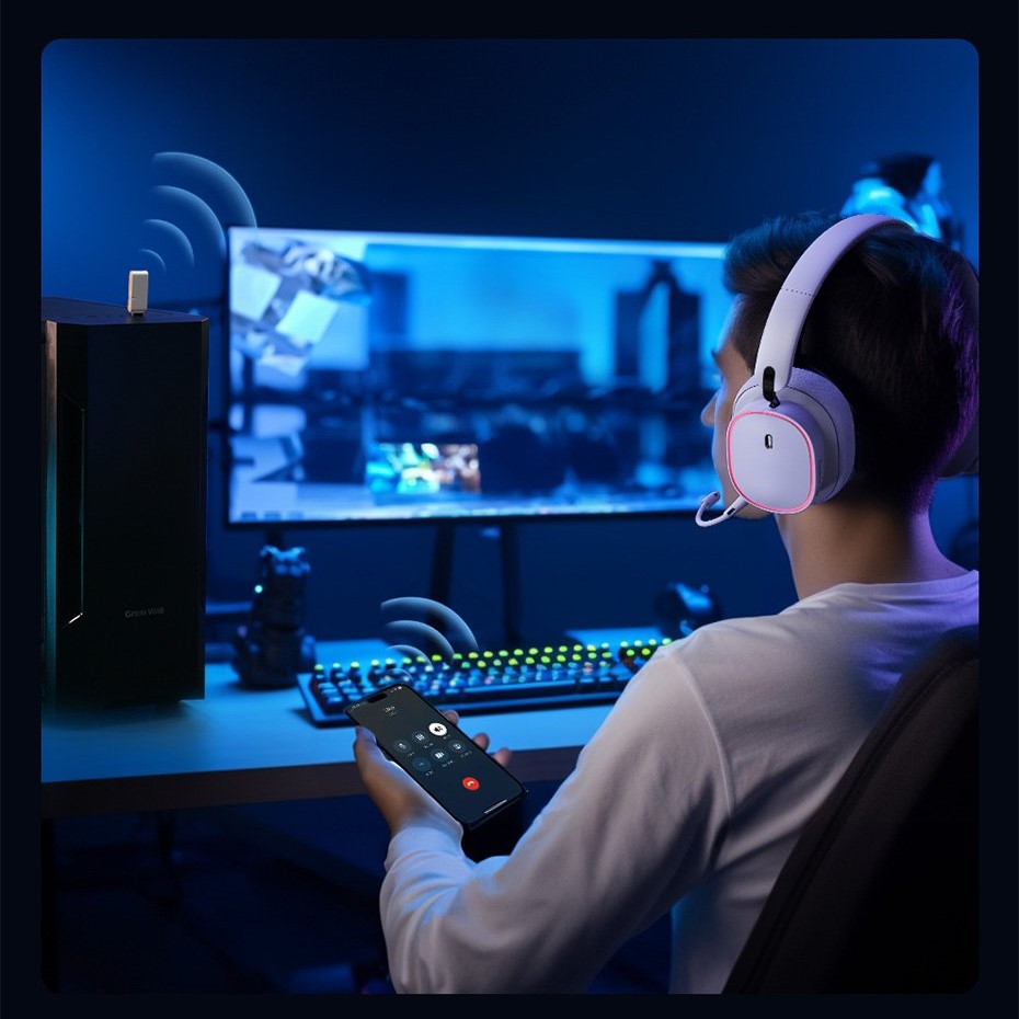 Tai nghe không dây Baseus GH02 hỗ trợ cả kết nối Bluetooth và 2.4G, mang đến khả năng chuyển đổi linh hoạt giữa các thiết bị như PC, laptop, và smartphone. Điều này giúp đảm bảo kết nối luôn ổn định, không bị gián đoạn và không có độ trễ, mang lại trải nghiệm âm thanh mượt mà.