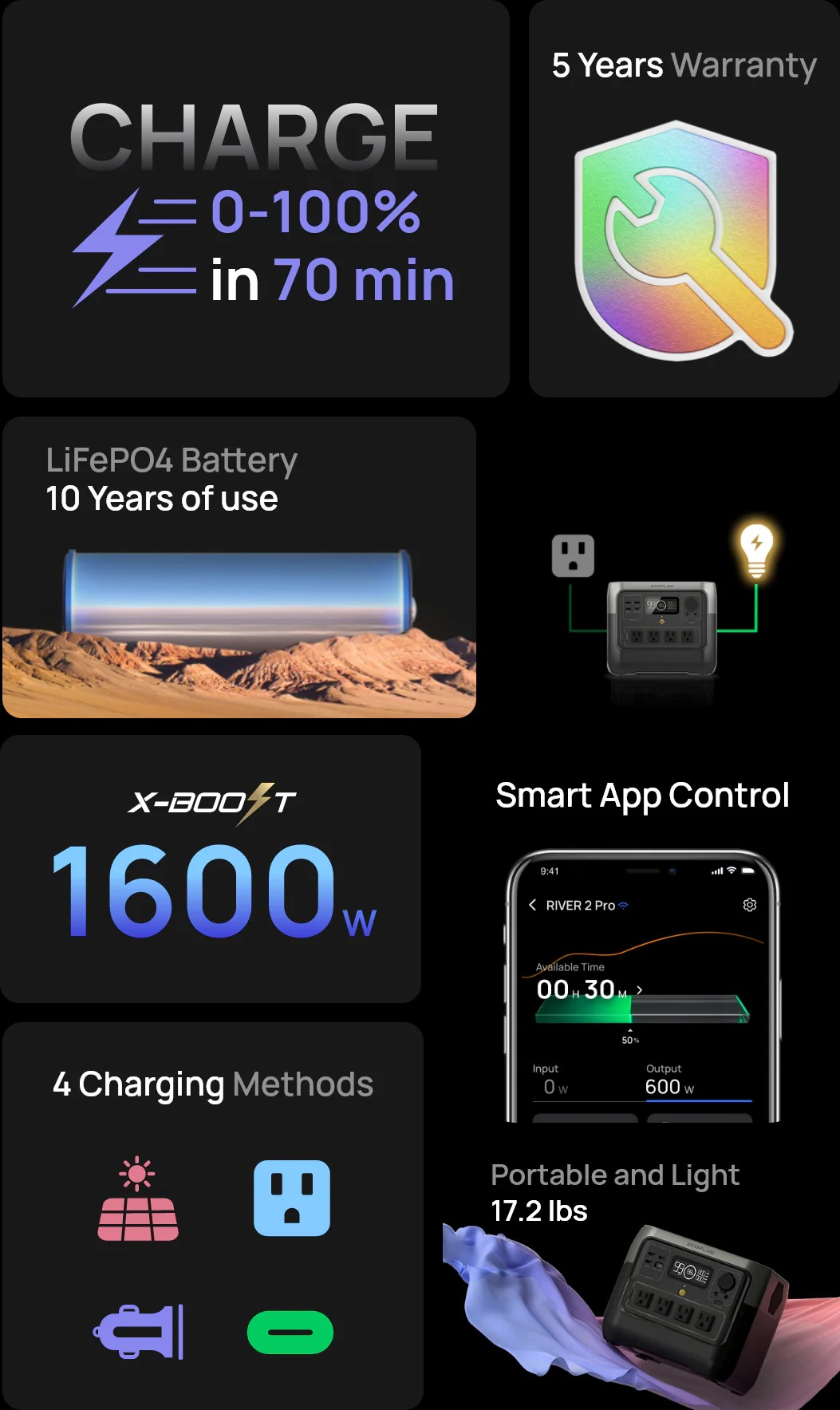 Với hơn 3000 chu kỳ sạc 100%, bạn có thể sử dụng RIVER 2 Pro hầu như mỗi ngày trong gần 10 năm. Công nghệ pin LFP không chỉ mang lại tuổi thọ cao mà còn an toàn, hiệu quả, và đáng tin cậy ngay cả ở nhiệt độ cao. RIVER 2 Pro có một trong những chế độ bảo hành dài nhất trong ngành.