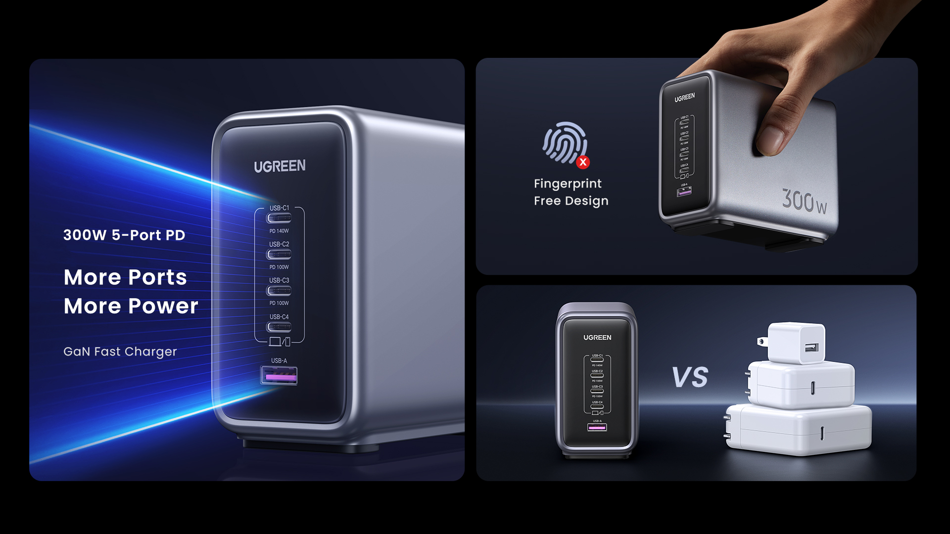Vào ngày 5 tháng 9, tại Sự kiện IFA Berlin 2023, Ugreen trình làng bộ sạc GaN 5 cổng 300W đầu tiên trên thế giới, được trang bị cổng đầu ra 140W chuyên dụng. Được thiết kế với mục đích sạc nhiều thiết bị, người dùng sẽ được trải nghiệm tốc độ sạc cực nhanh, giúp kết nối và cấp nguồn cho nhiều máy tính xách tay cùng một lúc, đồng thời hạn chế sử dụng bộ sạc riêng cho từng thiết bị.